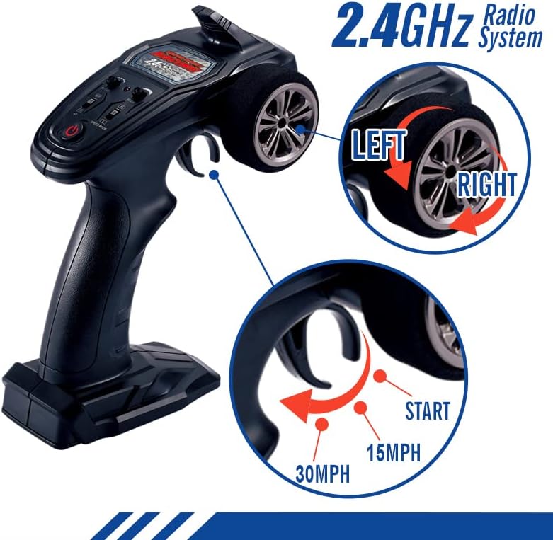 Completely assembled rc car with a range of up to 328FT/100M and 2.4Ghz highly responsive steering and throttle without inference. In addition, low speed mode (15MPH) for learning and smaller areas and high speed mode (30MPH) for racing and larger areas, which is perfect for everyone.