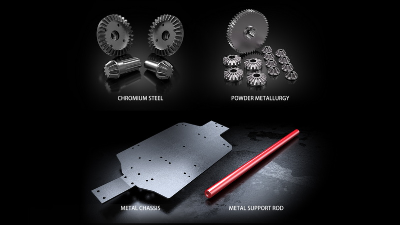 The transmission system is built using metal parts including metal differentials and drive shafts.