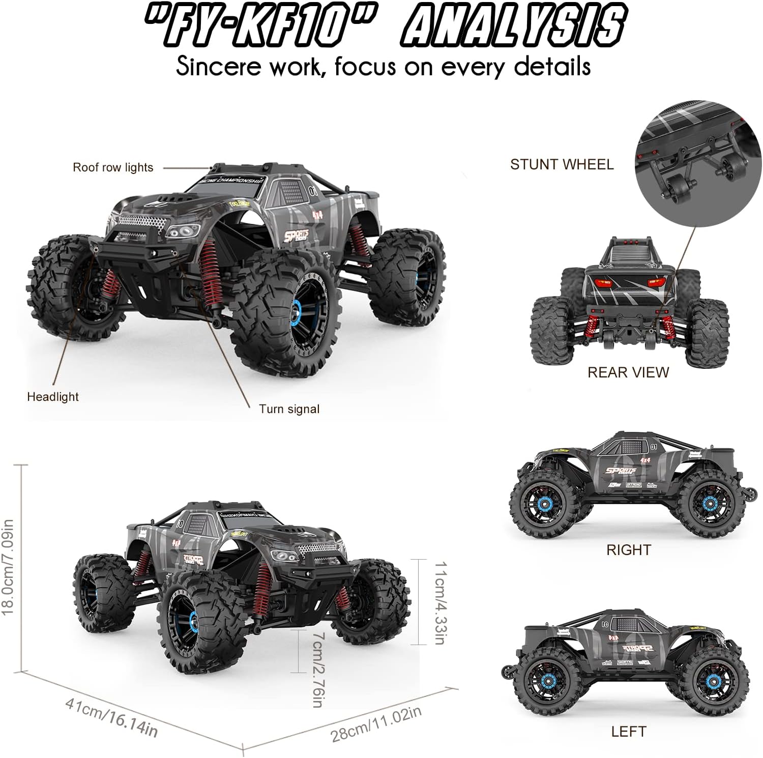 The High-performance 4WD RC car is powered by a 550 high-speed brushed motor with 2 differentials and can reach up to a maximum speed of 45 kph. If you’re looking for a fun gift for teenage boys, girls, or adults who love toy cars, these remote control cars must be ready to roll. It would be a great idea to choose a KF-10 1:10 scale RC car as an outdoor play toy, or birthday gift, opening up a new world of fun for new racers!